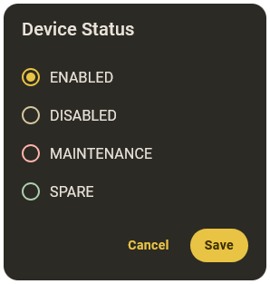 بالإضافة إلى تعديل معلومات الجهاز، تتيح لوحة تفاصيل الجهاز تحديث حالة الجهاز. يوجد زر نصي أسفل صورة الجهاز مباشرةً لهذا الغرض. بمجرد النقر عليه، سيتم عرض حوار يحتوي على خصائص الحالة المدعومة للاختيار منها. تشمل الخصائص المتاحة: