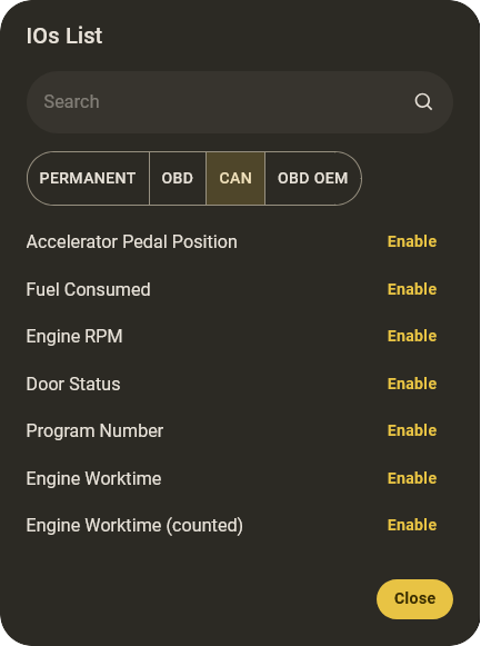 ملاحظة: إذا تم تمكين IO لجهاز لا يدعمه أو لIO غير متصل فعليًا بمدخل، فإن المعلومات المستلمة من الجهاز أو البيانات المستلمة في السجلات ستحتوي على قيم فارغة. قد تشمل القيم المتوقعة 0 أو null أو undefined. هذا لن يتسبب في تعطل التطبيق، ولكن بعض مكونات العرض عبر التطبيق قد تبدو فارغة.